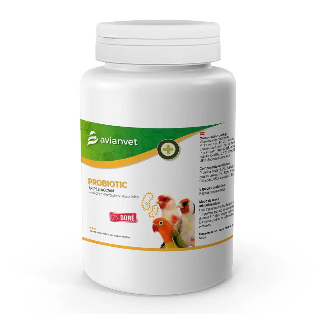 Ακόμη, τα προβιοτικά είναι ζωντανοί μικροοργανισμοί που αποικίζουν την εντερική χλωρίδα και βελτιώνουν την υγεία των πτηνών. Το Avianvet Probiotic Triple Accion περιέχει το βακτήριο Bacillus subtillis, ένα από τα πιο αποτελεσματικά προβιοτικά για τα πτηνά σε κλουβί.