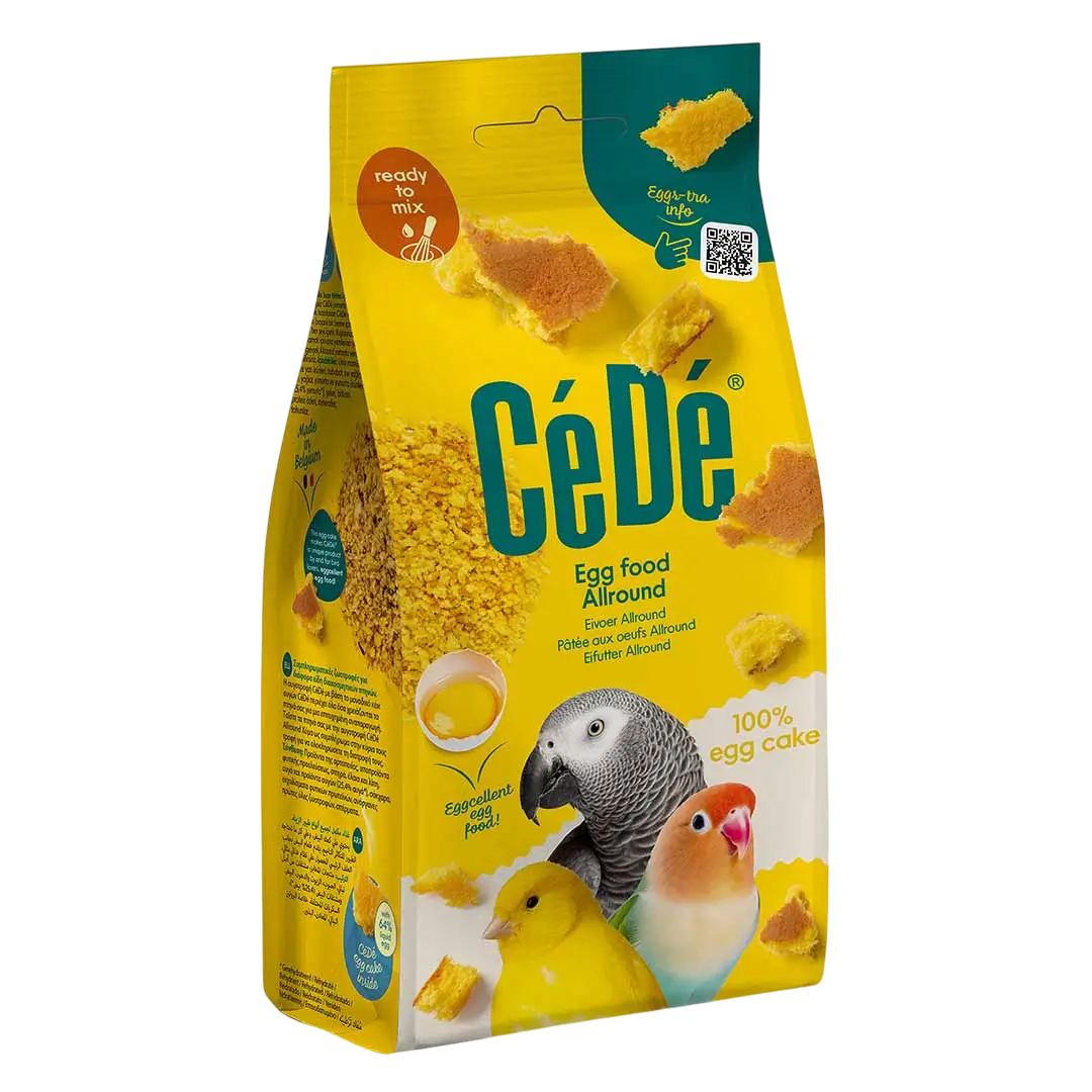 Η CeDe Allround Egg Cake αναμειγνύεται εύκολα με την κύρια τροφή ή πασπαλίζεται από πάνω για να ενισχύσει την όρεξη και τη θρεπτική αξία της καθημερινής διατροφής. Ιδανική αυγοτροφή για όλα τα καναρίνια, παπαγαλάκια και εξωτικά πτηνά, ειδικά κατά την περίοδο αναπαραγωγής ή πτερόρροιας.