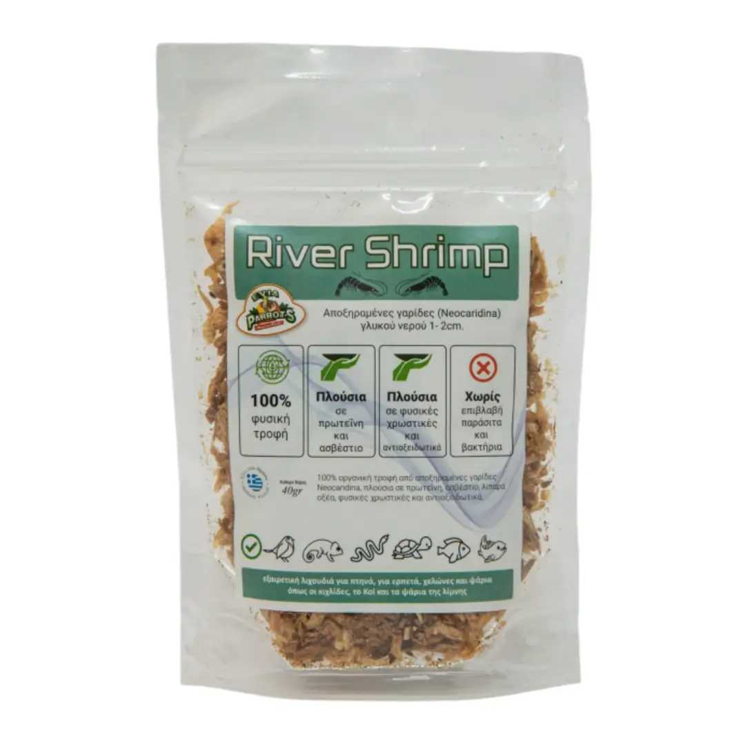 Το Evia Parrots River Shrimp είναι ένα διατροφικό προϊόν για πτηνά που περιέχει ολόκληρες αποξηραμένες γαρίδες γλυκού νερού (Neocaridina) 1-2 cm. Μία τροφή για εντομοφάγα αλλά και εντομοσποροφάγα πτηνά σε περόδους αυξημένων διατροφικών αναγκών.